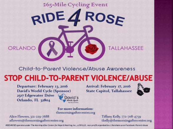 Rosemary was an avid cyclist, and on February 13, 2016, Alice, her friends, supporters, and family will undertake a 4-5 day cycling trip to raise awareness to this growing problem that remains hidden in the shadows. This ride’s goal is to draw attention to a legislative need for a bill which will help victims get the support they desperately need. Florida law-makers must be better informed about Child to Parent Violence/Abuse because most victims are primarily women, and they feel embarrassed or helpless not knowing where to turn.