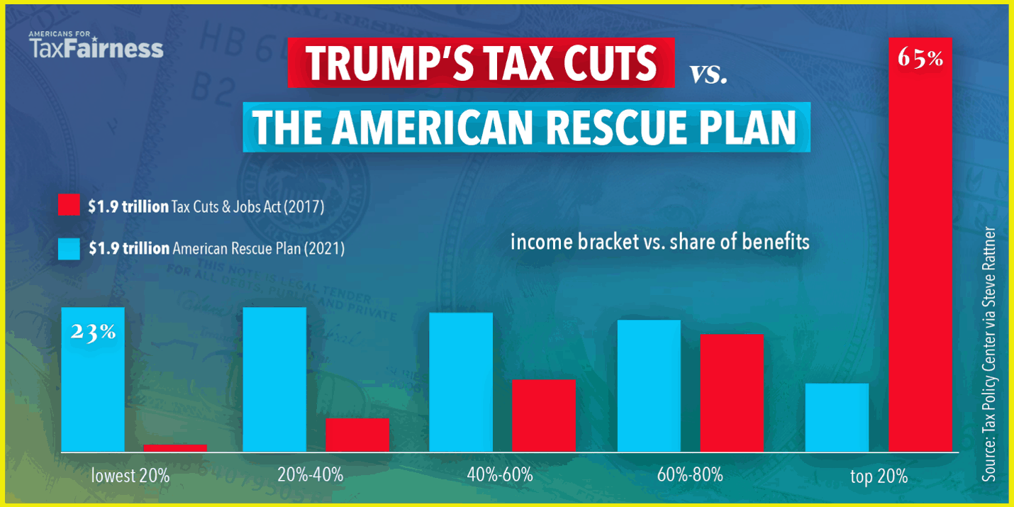 Taxing some of the towering wealth of billionaires would be the diametric opposite of the last overhaul of the U.S. tax code, 2017’s Trump-GOP tax cuts. Those tax cuts, which coincidentally cost the same estimated $1.9 trillion over 10 years as Biden’s ARP, mostly benefitted the wealthy and corporations—very much including billionaires and the businesses they control. According to the Tax Policy Center, 65% of the TCJA’s benefits will go to the highest-income 20% of American households. By contrast, about 90% of the ARP’s benefits will go to the bottom 80% of households, with nearly a quarter (23%) going to the lowest-income fifth.