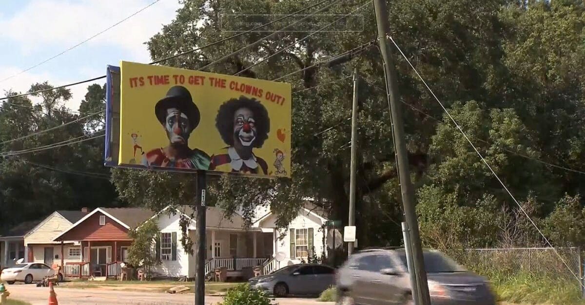 A billboard in Montgomery, Alabama, has ignited a storm of backlash after displaying the words “It’s Time to Get the Clowns Out!” alongside images of people in racist blackface, all framed in the branding of Donald Trump’s “Make America Great Again” slogan.
